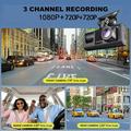 - Triple camera system: front, interior, and rear recording simultaneously