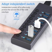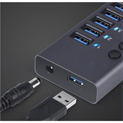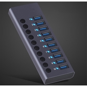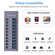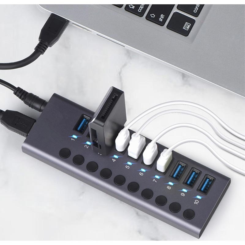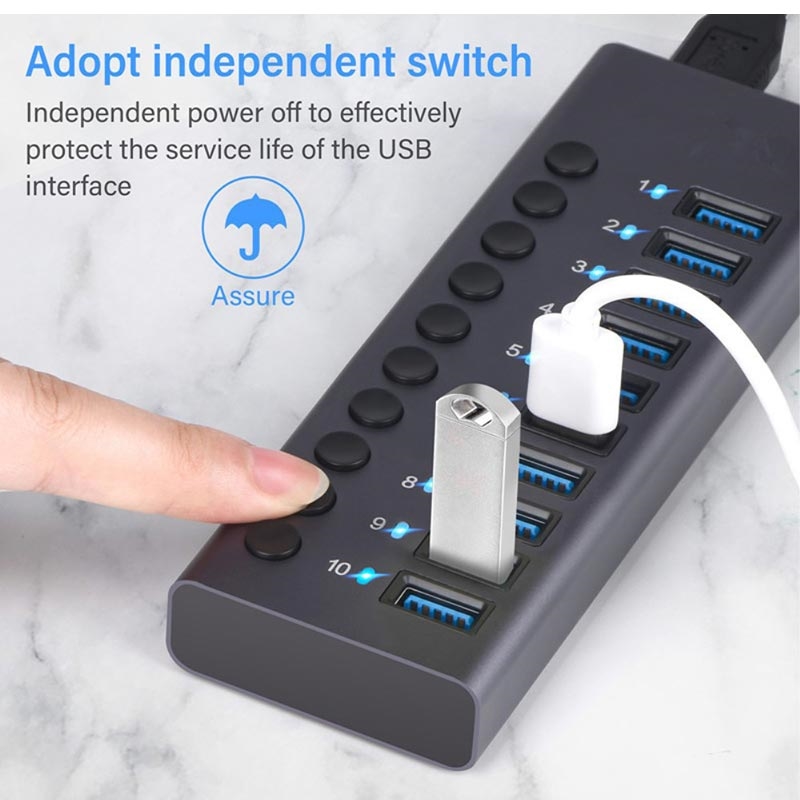 - 10 portů umožňuje současné nabíjení více zařízení. Umožňuje přístup k USB flash disku, čtečce karet, externímu pevnému disku a dalším periferním zařízením USB pro přístup nebo nabíjení