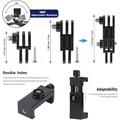 The included mobile phone holder supports portrait and landscape shooting with 360 rotation. Adjustable clamp fits phones 58-100 mm wide, providing stable framing for vlogs and live content.