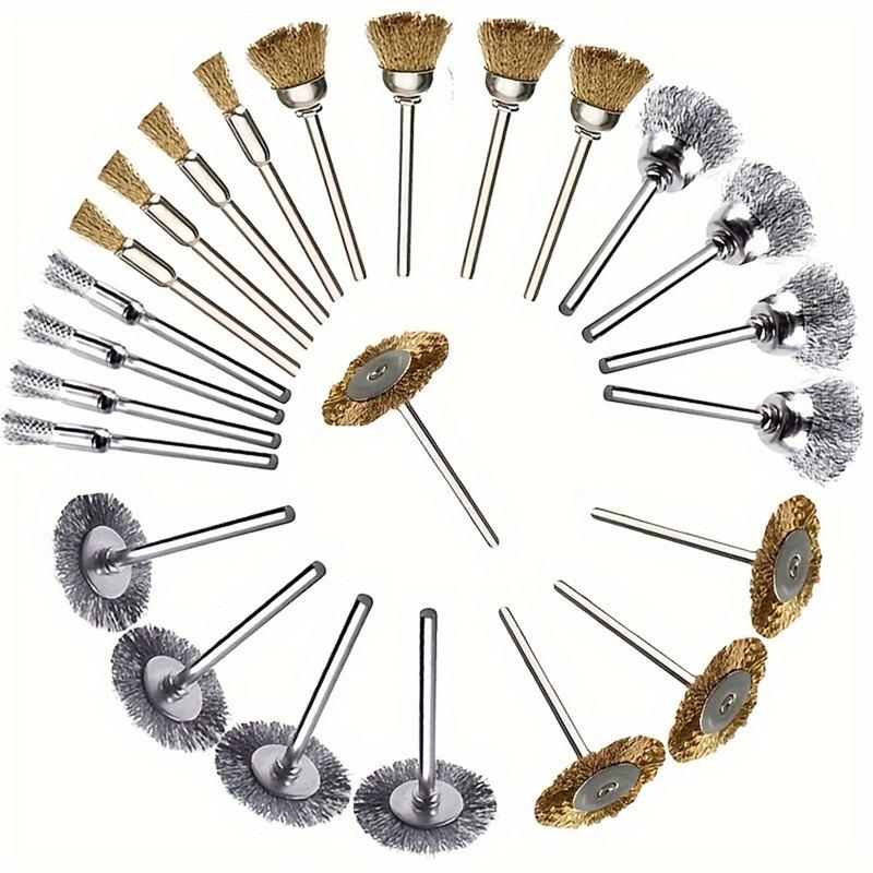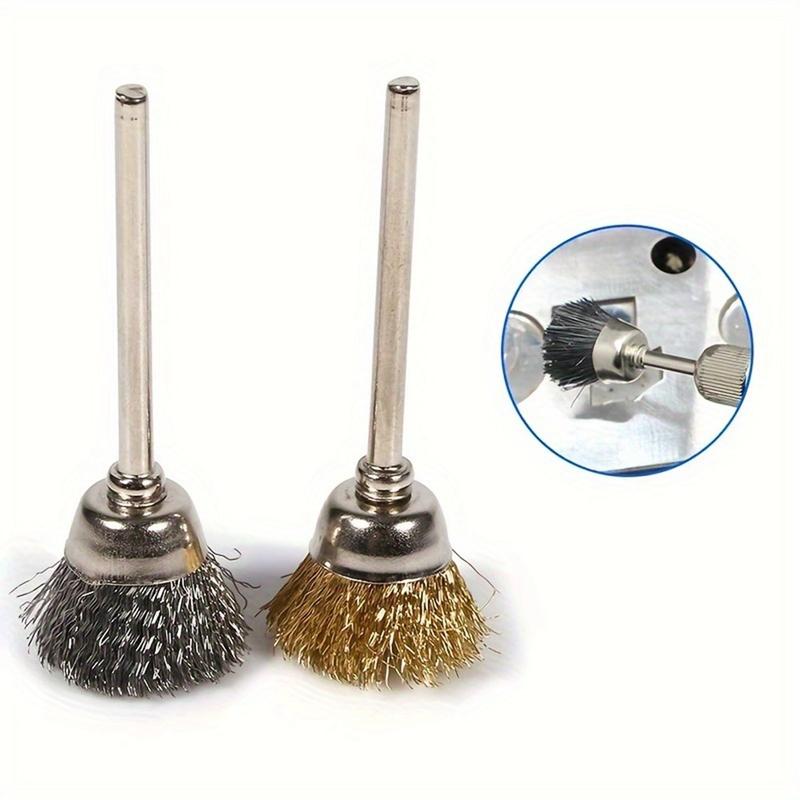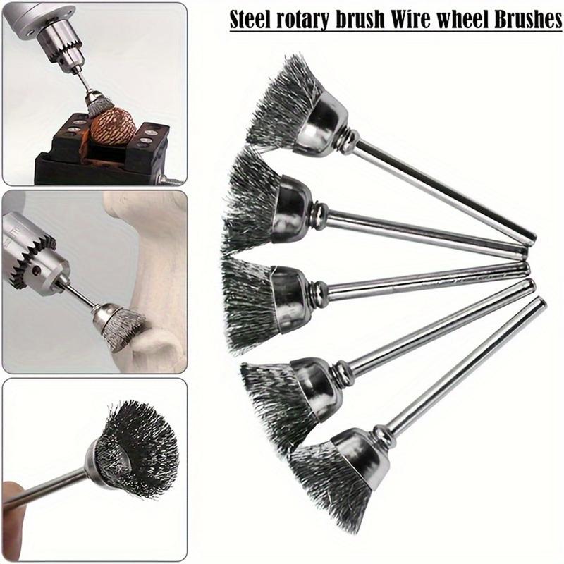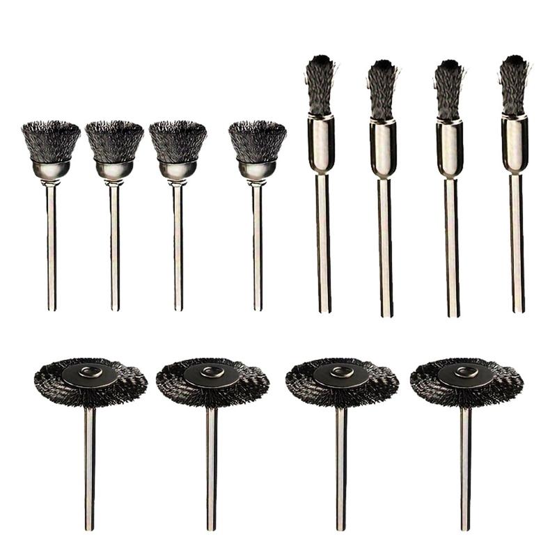 Give every rotary tool in your workshop new life with this versatile 12-piece steel wire brush kit. The set includes four pen-shaped, four bowl-shaped and four T-shaped brushes, each fitted with a standard 3mm shank that snaps straight into mini drills, electric grinders and hobby rotary tools. Whether you are stripping flaking paint from railings, polishing weld seams on stainless steel or clearing carbon deposits from engine parts, the high-tensile steel bristles bite through grime without gouging the base metal.