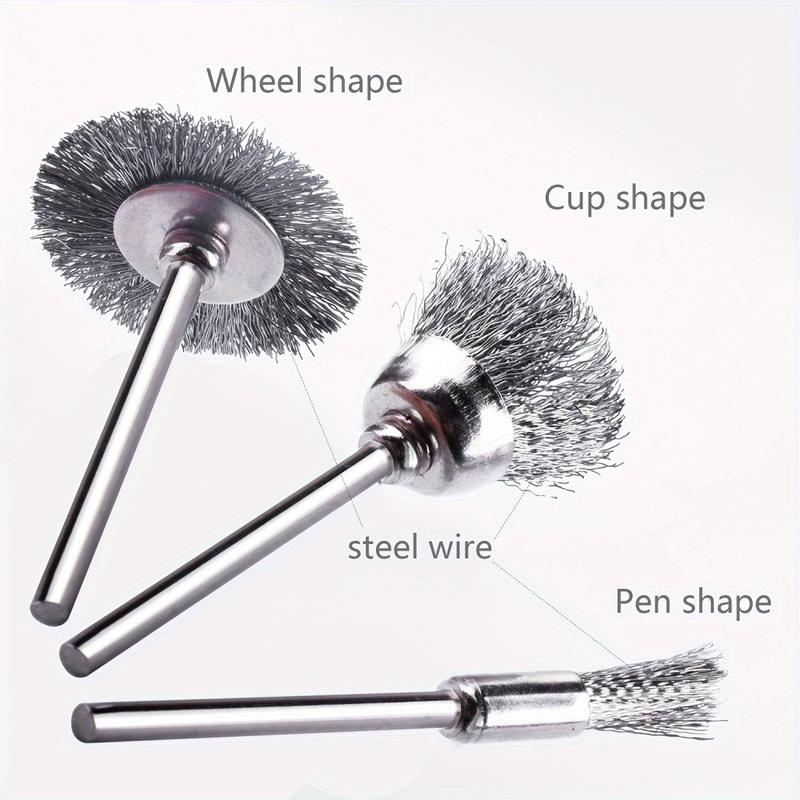 12 Pcs. Steel Wire Brush Set 3mm Shank - Pen, Bowl and T Shapes for Rotary Tool Rust Removal and Polishing