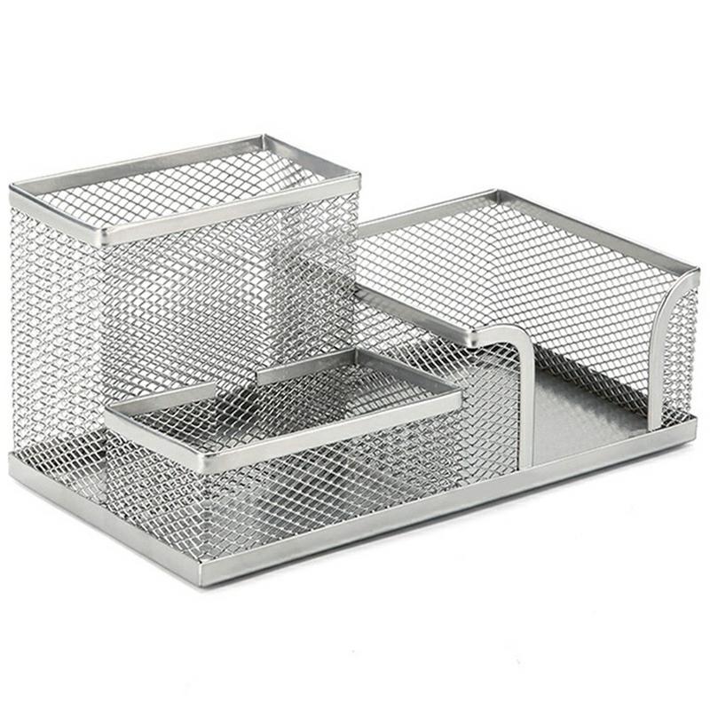 Conquer clutter in seconds with this sleek metal mesh storage box. Three separate sections keep pens, clips, scissors and sticky notes in perfect order, while the airy mesh design adds a contemporary touch to any desk, shelf or vanity.