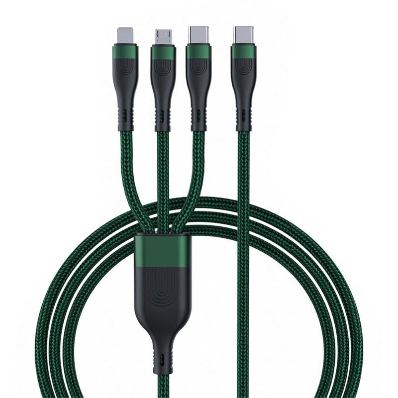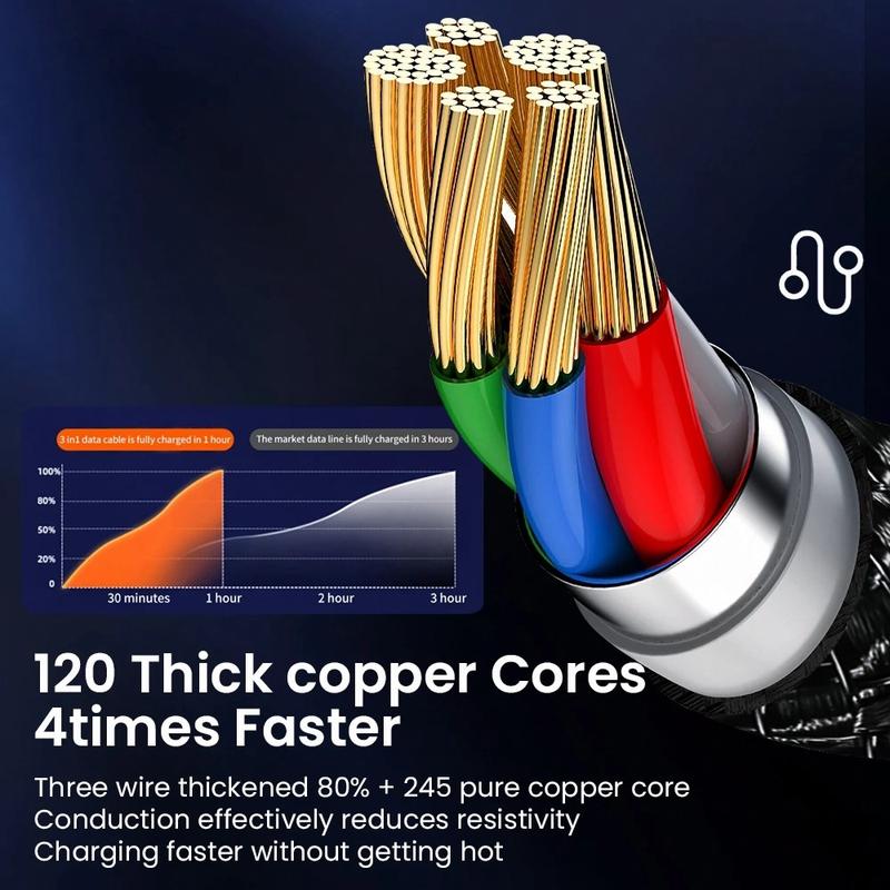 It replaces three separate cables with one tough, nylon-braided 1.2 m lead. The Type-C interface supports up to 5 A PD 100 W fast charge, the E-marker helps manage power safely and efficiently, and the 20,000+ bend rating is built for daily use—excellent value for charging and data with fewer cables to carry.