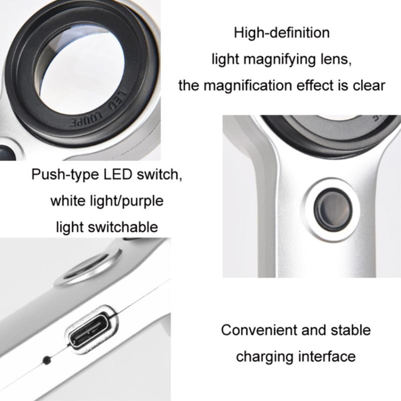 30x Handheld Rechargeable Magnifying Glass / Jewelry Identification Magnifier with LED/UV Light
