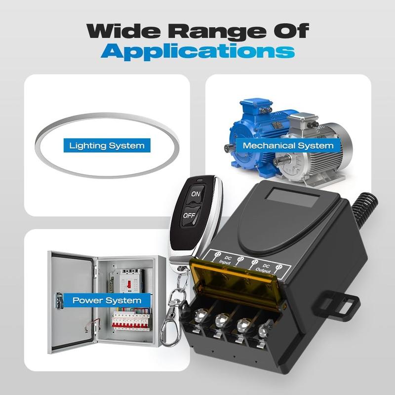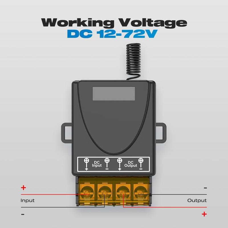 Control your DC-powered devices wirelessly with this 433MHz RF relay switch kit, designed for convenient remote on/off operation across a wide range of applications. Suitable for 12V-72V systems, it can be used with LED lighting, fans, motors, pumps, and selected security or automation setups. The included receiver and two remote controls give you flexible operation for home projects, workshops, garages, gates, and equipment control.
