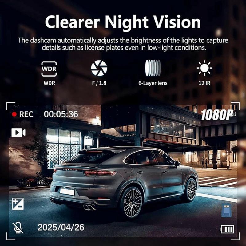 - G-sensor + loop recording: automatically locks collision clips and overwrites old files when storage is full