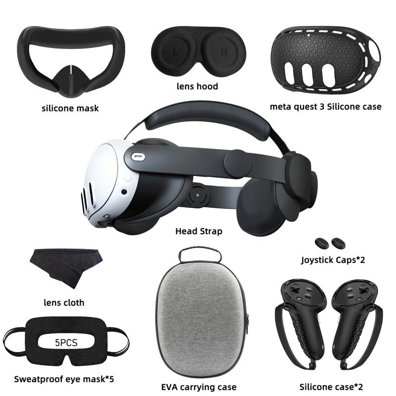 9-Piece Accessory Kit for Meta Quest 3: Head Strap, EVA Storage Case, Silicone Handle Covers, and More - Black
