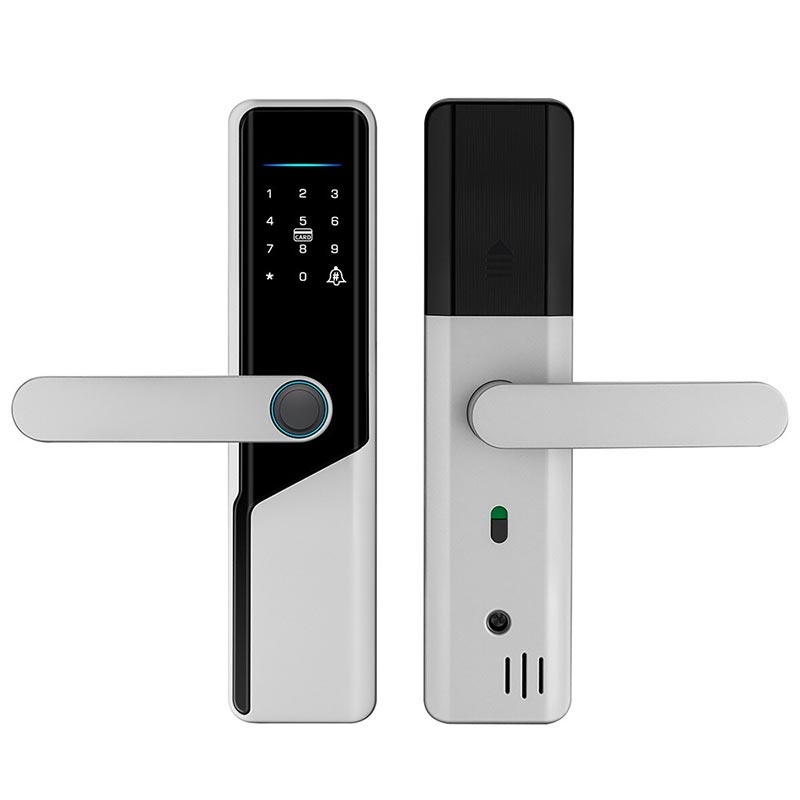 Enhance your home security with the A1 Tuya WiFi Fingerprint Smart Door Lock. This advanced electronic lock offers multiple access methods, including fingerprint recognition, dynamic passwords, and NFC, providing both convenience and robust protection. Its sleek silver design complements various door styles, making it an ideal choice for modern homes.