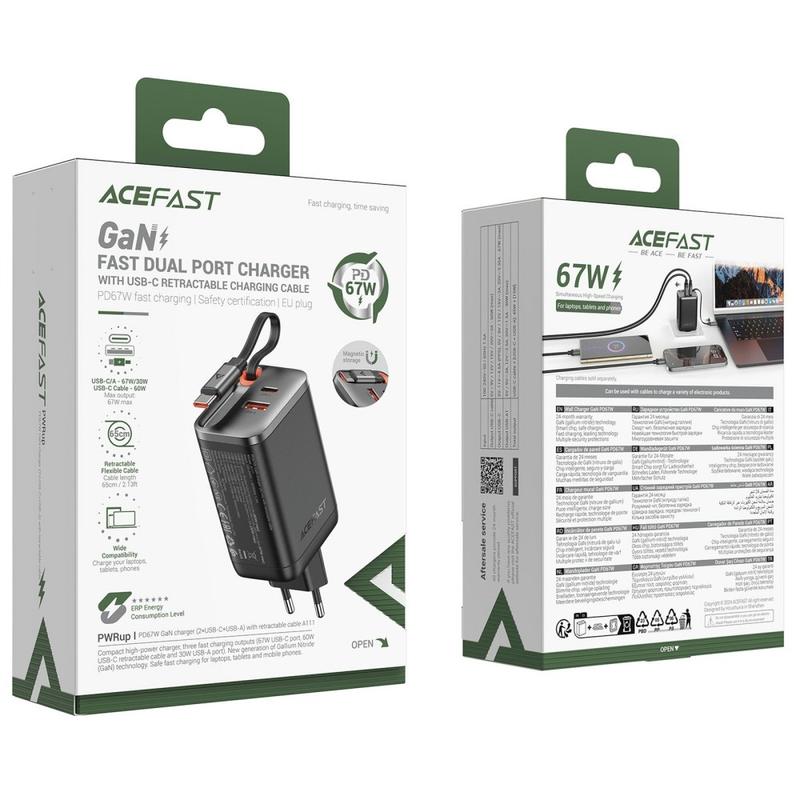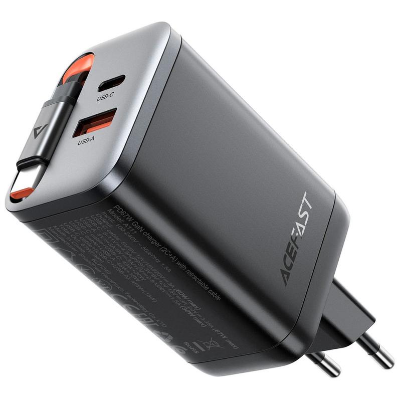 Acefast A111 67W GaN Charger with Retractable USB-C Cable, USB-C and USB-A Ports – EU Plug