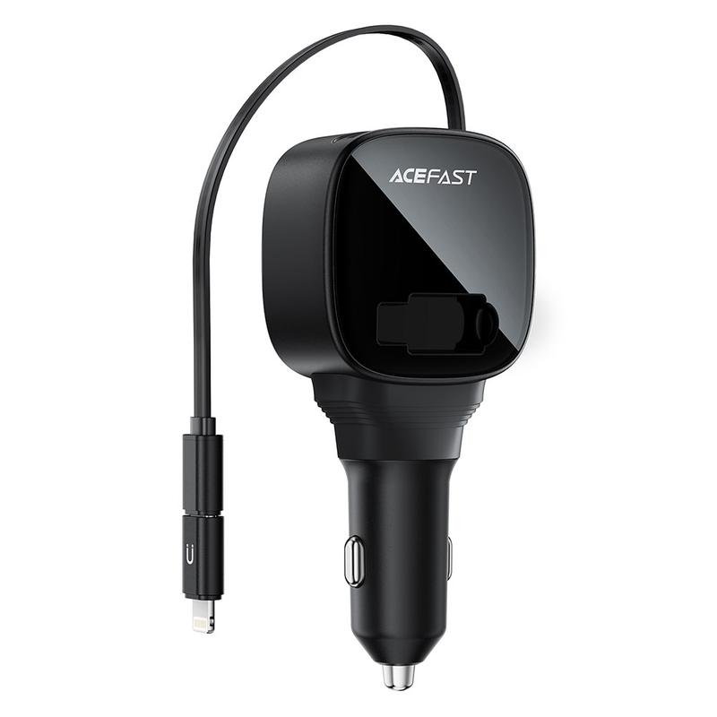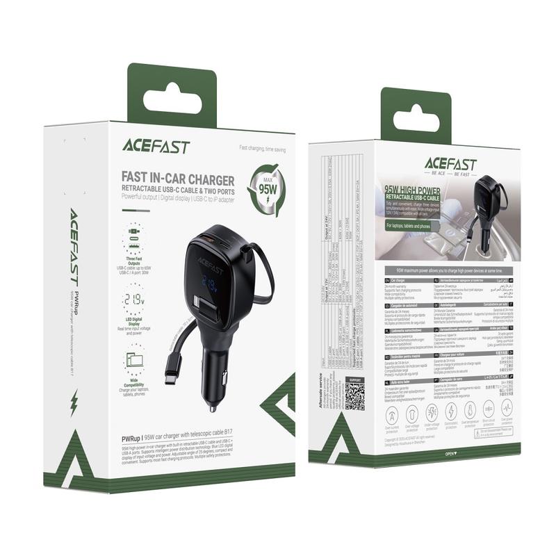 Acefast B17 95W Fast Car Charger - USB-C/USB-A with LED Display & Retractable Cable