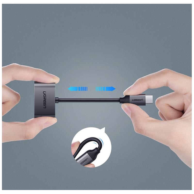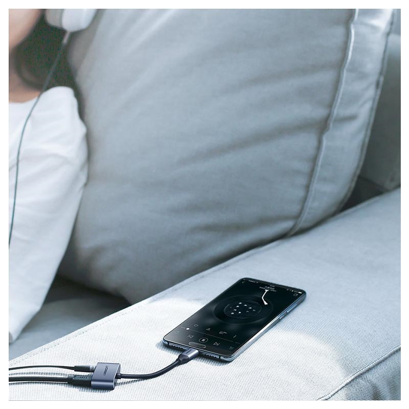 Adaptér pro nabíjení a zvuk Ugreen 2-in-1 transformuje port USB-C vašeho zařízení na dva porty, USB-C a 3,5 mm. Oba porty můžete použít najednou, takže můžete poslouchat hudbu nebo přijímat hovory při dobíjení zařízení.