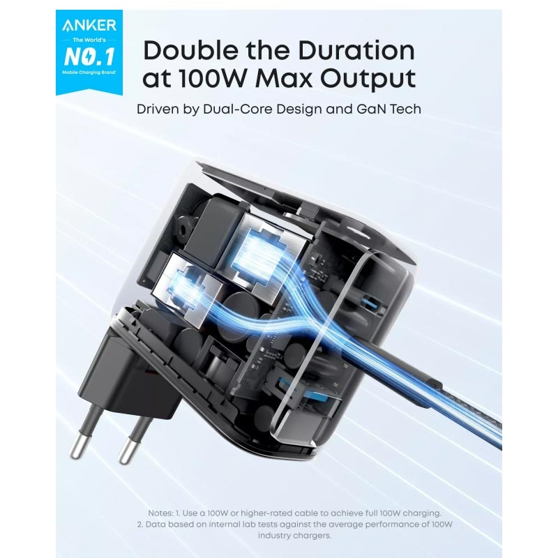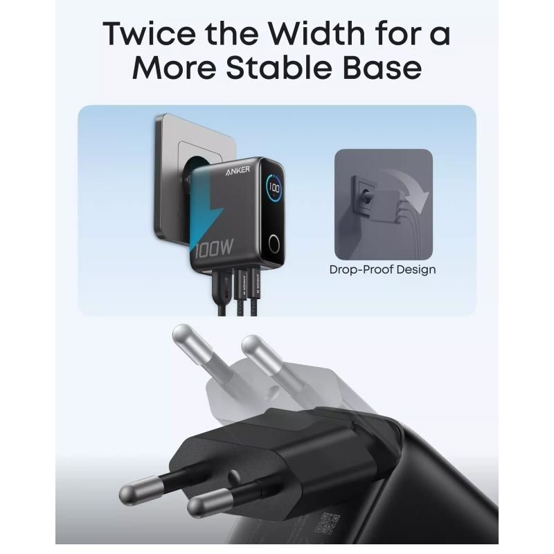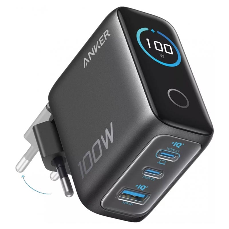 The Anker 100W GaN wall charger with smart display is a powerful and compact charging solution designed for users who need fast, efficient charging for several devices at once. With 2 USB-C ports, 1 USB-A port, advanced GaN technology, and a built-in digital display, it gives you a smarter and more convenient way to power laptops, smartphones, tablets, earbuds, and other everyday devices.