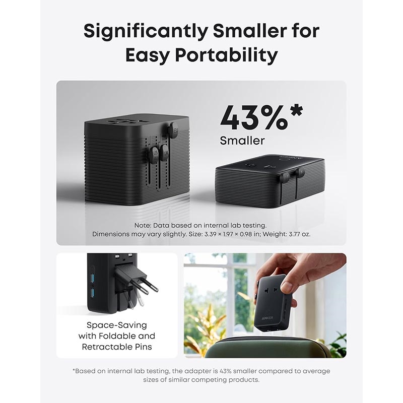 - Ultra-compact design, 43% smaller than similar adapters, with foldable and retractable pins