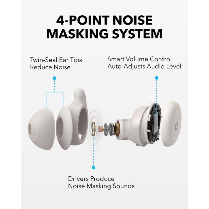 The Soundcore Sleep A20 earbuds are designed to provide a peaceful sleep experience with advanced noise-blocking and comfort features. Equipped with a 4-Point Noise Masking System, they are perfect for those who need a quiet, distraction-free environment for restful nights.