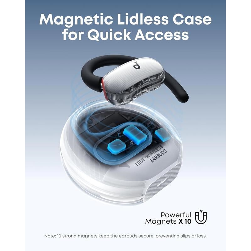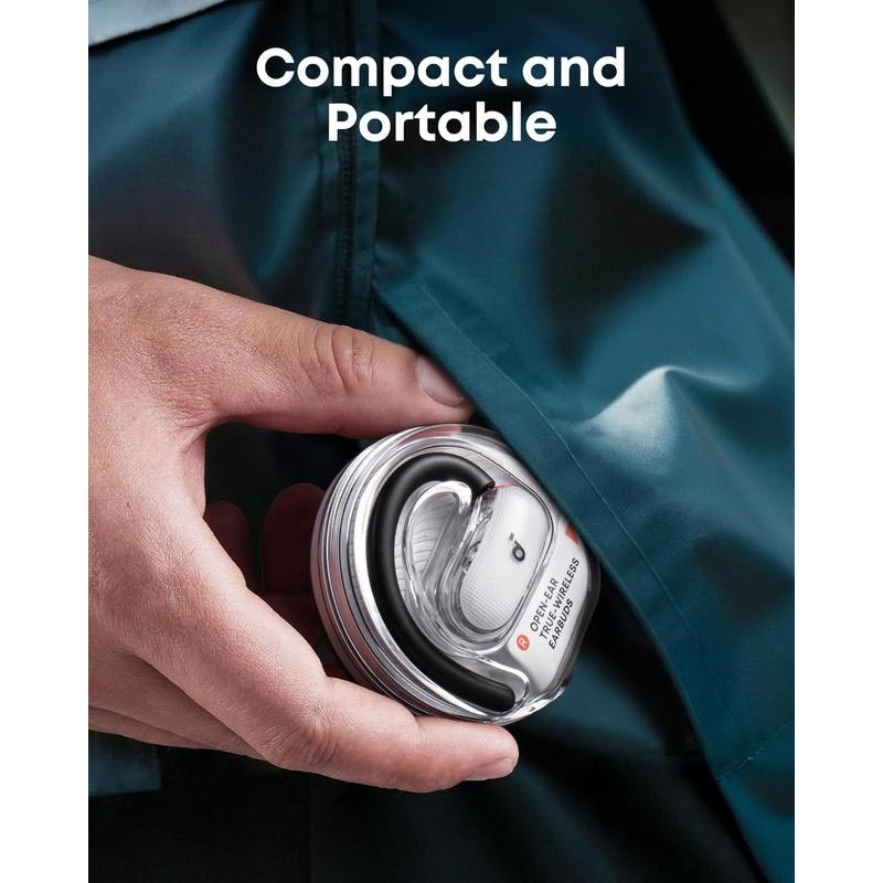 The Soundcore V40i open-ear headphones are designed for active lifestyles where comfort, awareness, and sound quality matter. With an innovative open-ear design and adjustable ear hooks, they sit comfortably outside the ear canal, letting you enjoy music while staying aware of your surroundings. The sleek, lid-free transparent charging case adds a modern touch and allows quick, effortless access wherever you are.