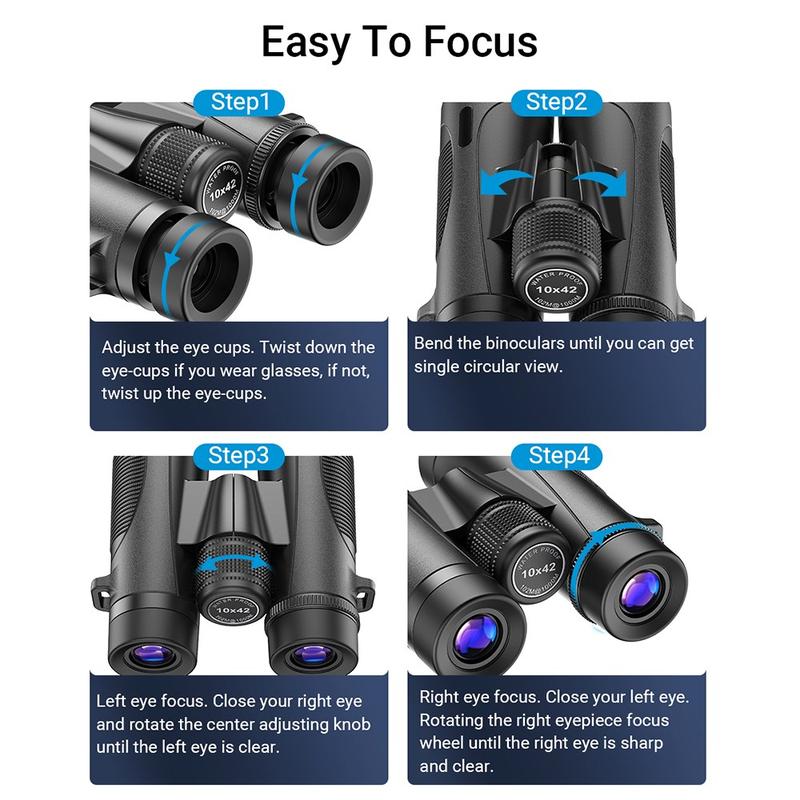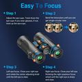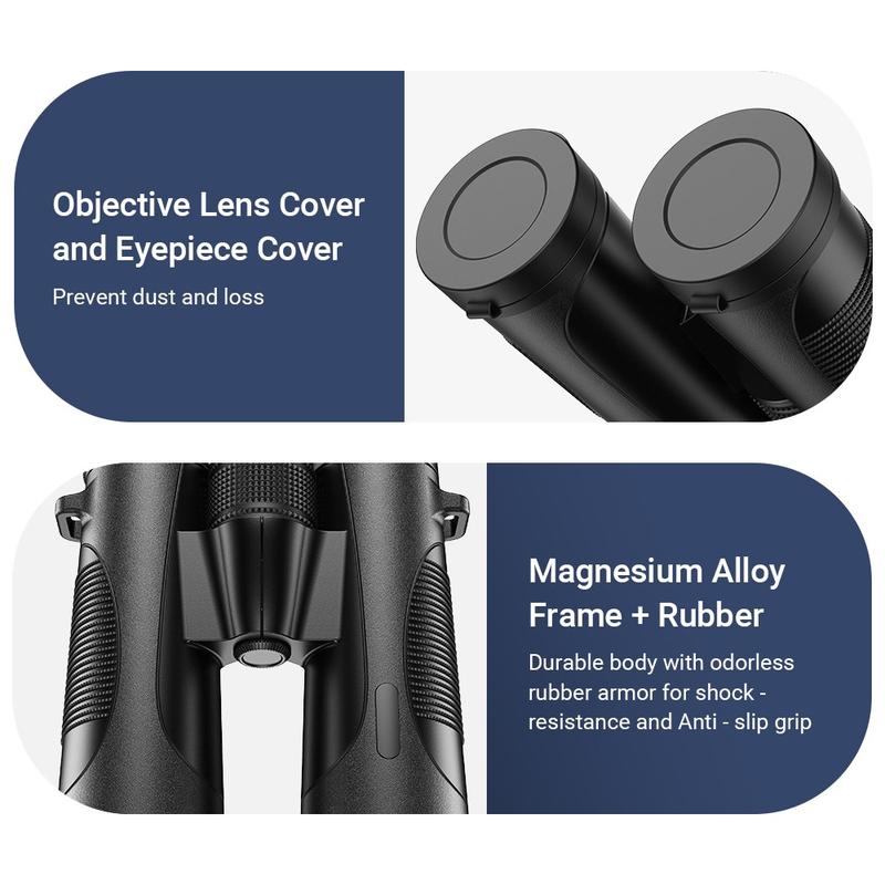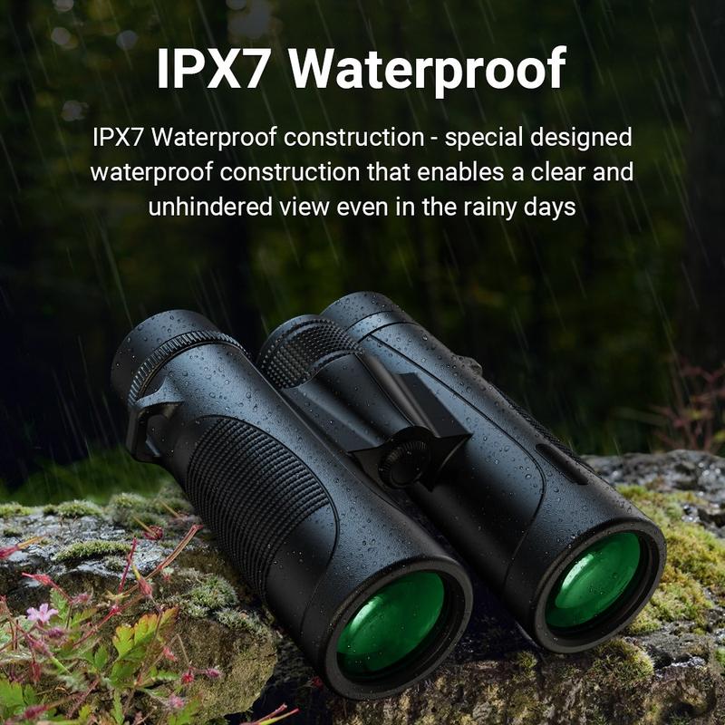 Designed for performance in all-weather environments, these binoculars include an IPX7 waterproof rating, ensuring clear viewing even in heavy rain or humid conditions. The rubber-coated exterior provides a secure, anti-slip grip and enhanced shock resistance for rugged outdoor use.