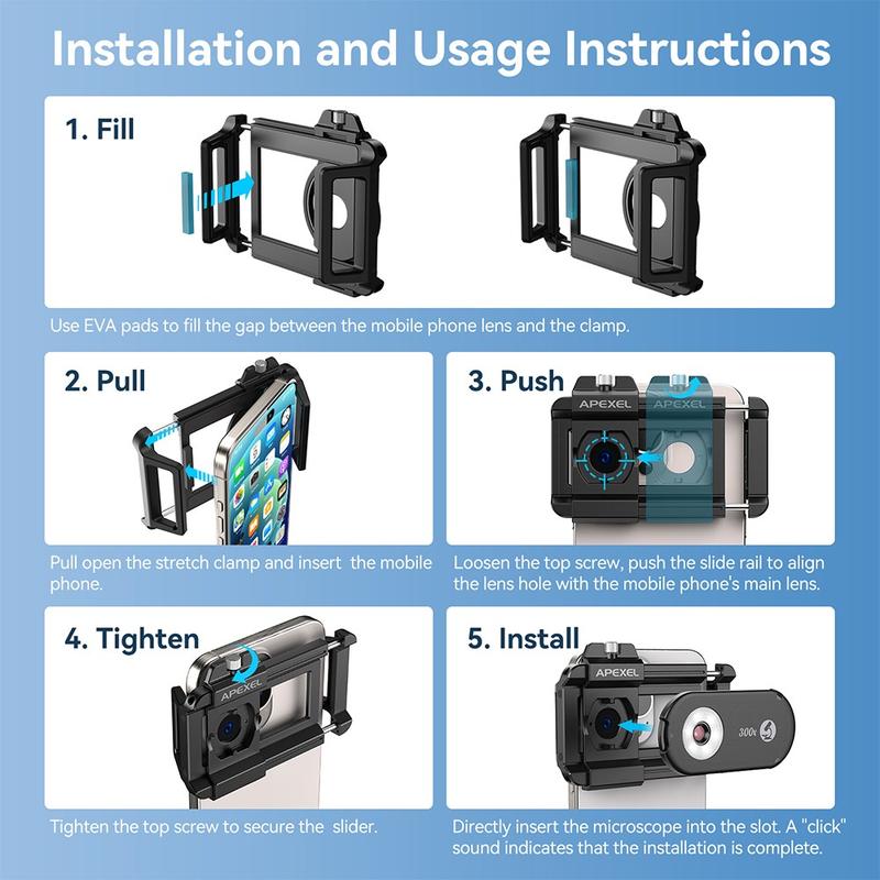 Turn your smartphone into a powerful portable microscope with the APEXEL APL-MS300 300X clip-on microscope lens. Designed with professional-grade optics and advanced lighting systems, this compact attachment brings laboratory-level magnification right to your phone — perfect for science enthusiasts, educators, jewelers, and technicians.