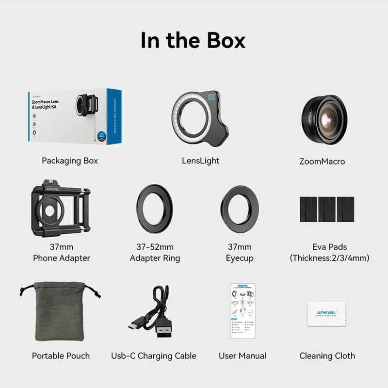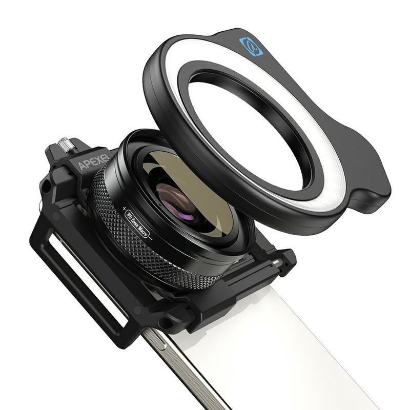 Apexel APL-ZM100FL26 Professional Zoom Macro Lens with 9-Mode Ring Light - 52mm/37mm Thread