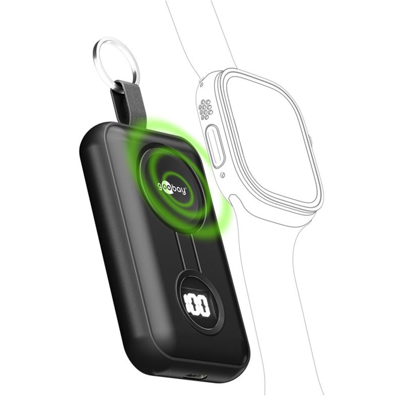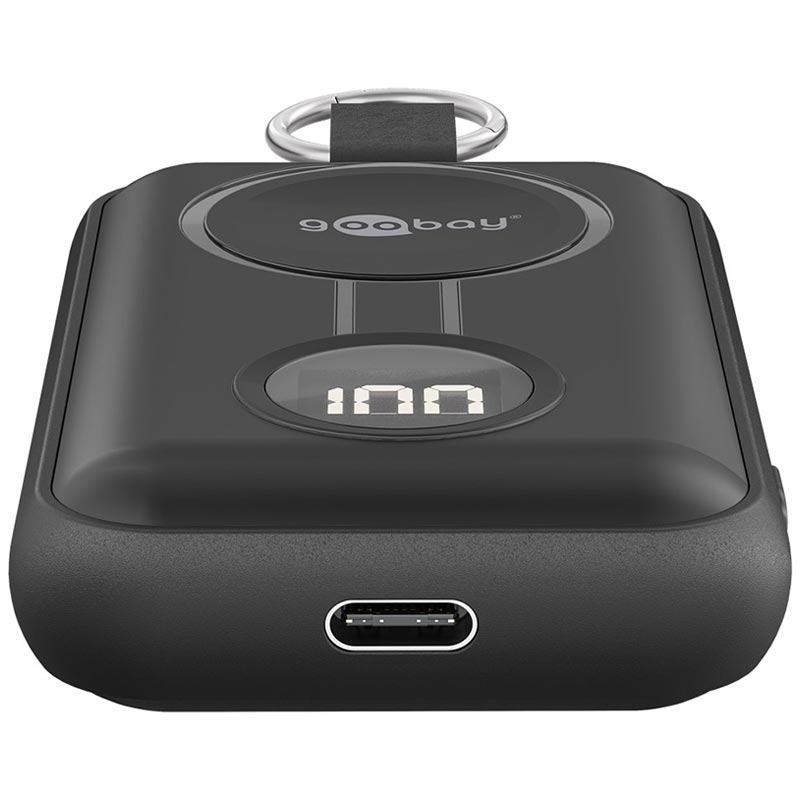 Goobay Wireless Power Bank for Apple Watch 2500mAh - Magnetic Watch Charger with USB-C, LED Display, Key Ring, 2.5W Wireless / 5W Wired