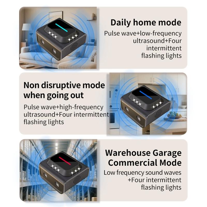 Combining ultrasonic waves, dual-pulse pressure waves, and a high-intensity LED strobe, the device creates a highly uncomfortable environment for pests while remaining safe for humans and pets.
