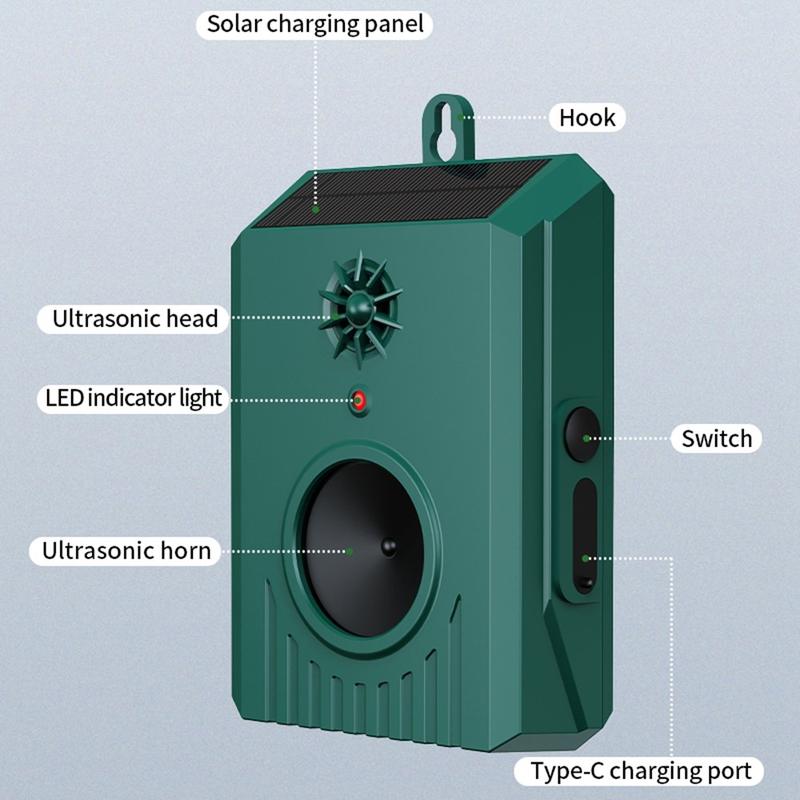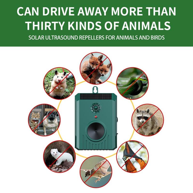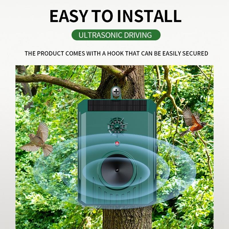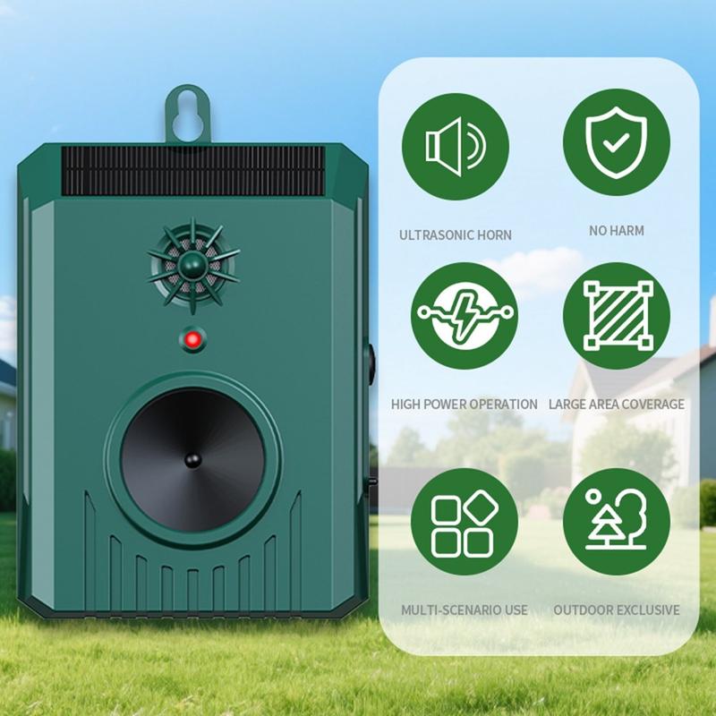 Combining ultrasonic waves (8-35KHz) with audible sound, the device effectively deters birds, rodents, bats, dogs, squirrels, and other wildlife. The dual-action design increases the repelling success rate across a wider range of pests.