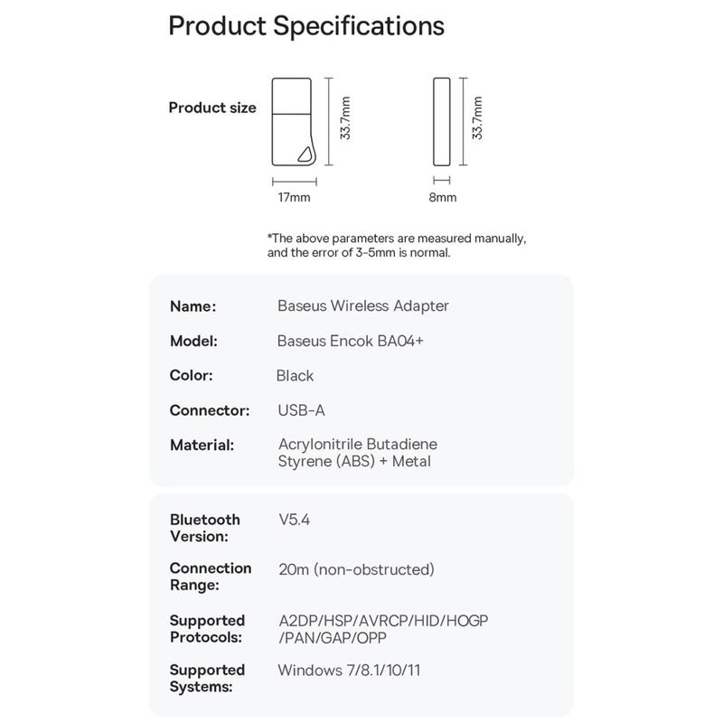 Upgrade your PC or laptop with the BASEUS Encok BA04+ USB Bluetooth-Compatible Adapter. Its 20 m wireless range, extensive protocol support, and solid ABS+metal construction ensure a steady, high-quality connection for all your favorite devices. Whether you need to link up speakers, keyboards, or other peripherals, this compact dongle simplifies your setup while keeping you connected.