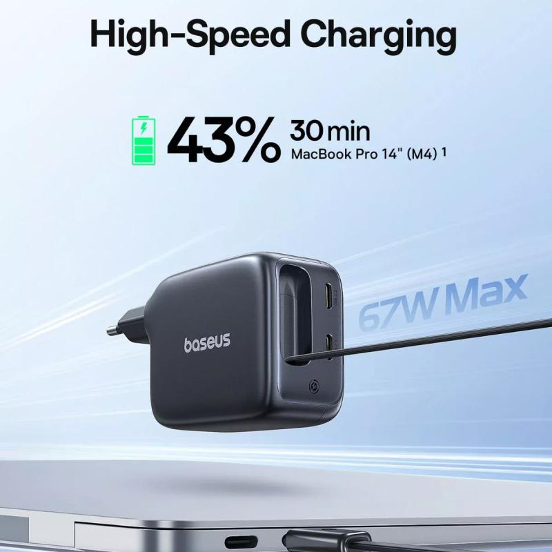 Baseus EnerCore CJ11 67W GaN6 Wall Charger with Retractable USB-C Cable - 3x USB-C Fast Charging Adapter