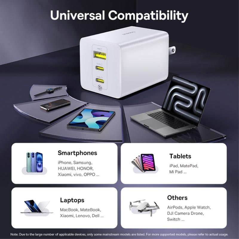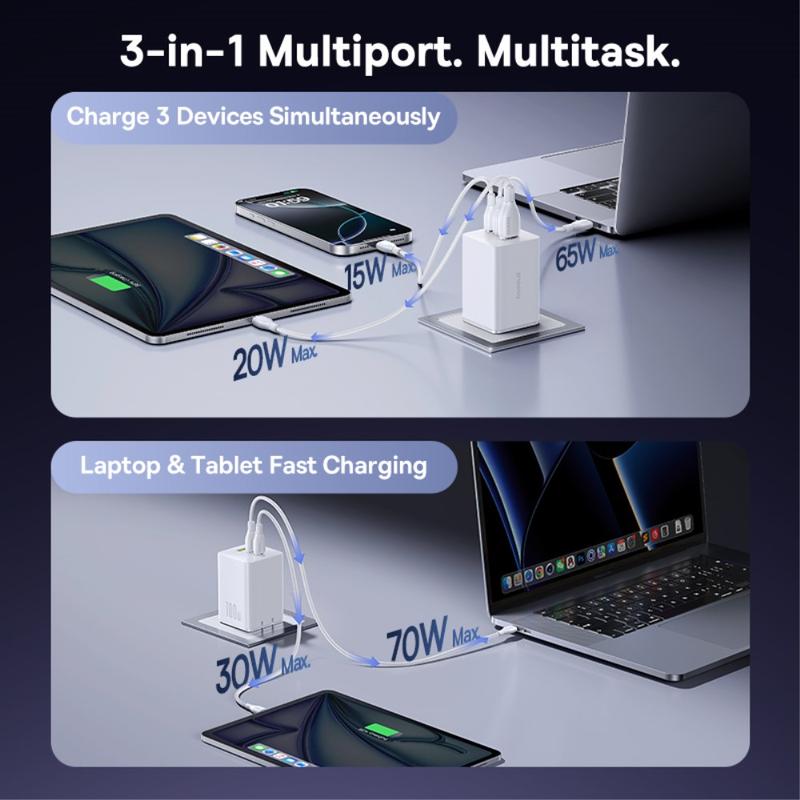 - Intelligent power distribution: 70 W + 30 W on dual USB-C, or 65 W + 20 W + 15 W across all three ports