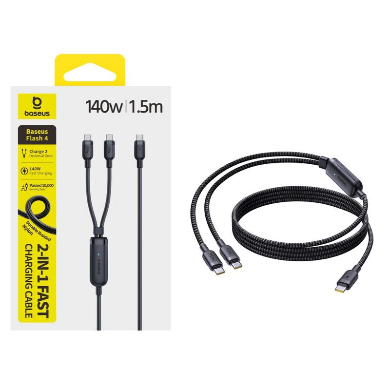 Baseus Flash 4 2-in-1 USB-C to Dual USB-C Fast Charging Cable 1.5m - PD 3.1 140W Multi-Device Charger Cord with Cable Organizer