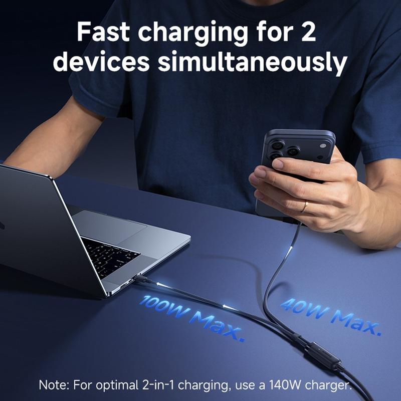 Charge two devices from one cable with the BASEUS Flash 4 2-in-1 fast charging cable. Designed for modern USB-C devices, this smart charging cable combines high power output, broad compatibility, and practical cable management in one travel-friendly solution. It supports up to 140W max for single-device charging and can also intelligently split power between two devices at the same time, making it ideal for laptops, tablets, phones, handheld consoles, and more.