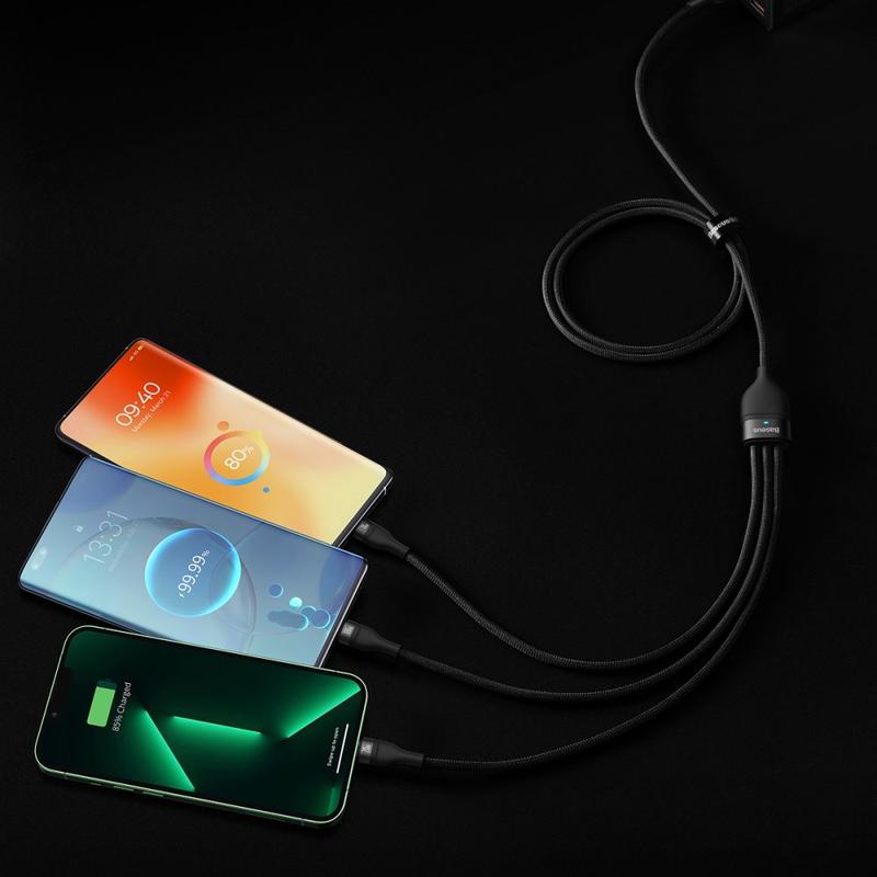 Charge more devices with fewer cables using the Baseus Flash Series 3-in-2 fast charging cable. This smart multi-connector cable features dual input (USB-A and USB-C) and three outputs (USB-C, Lightning, and Micro USB) for wide compatibility with phones, tablets, accessories, and more. Built-in recognition chips help distribute current and voltage safely, while LED charging indicators show fast charging status at a glance. The durable nylon braided jacket and reinforced construction make it a reliable everyday cable for home, office, travel, or car use.