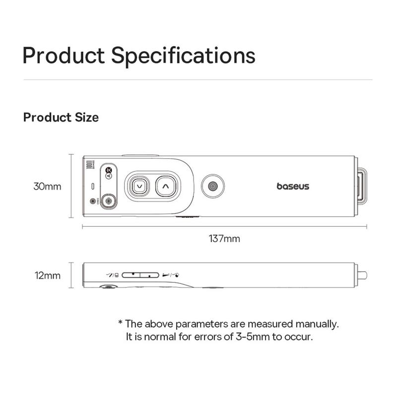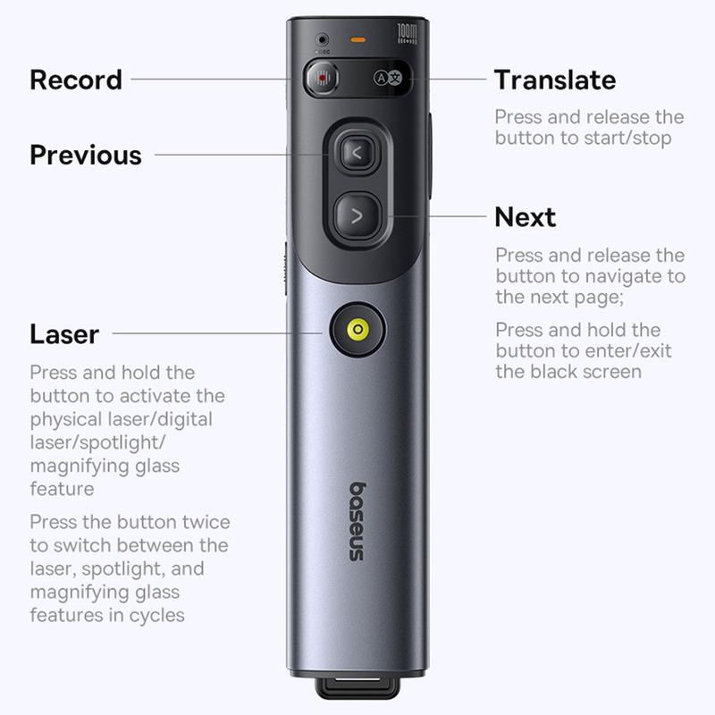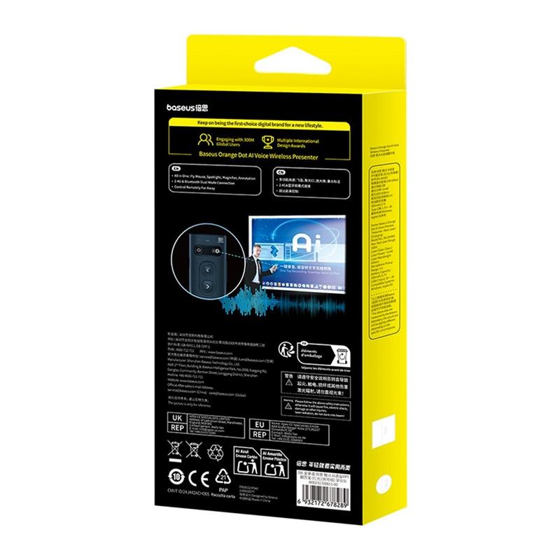 Achieve seamless and polished presentations with the BASEUS Orange Dot AI Voice Wireless Presenter. Featuring dual-mode connectivity (2.4G and Bluetooth 5.1), three different laser options, and a suite of convenient functions, this presenter caters to professionals and educators alike. With its long control range and robust battery life, you can command attention from any corner of the room.