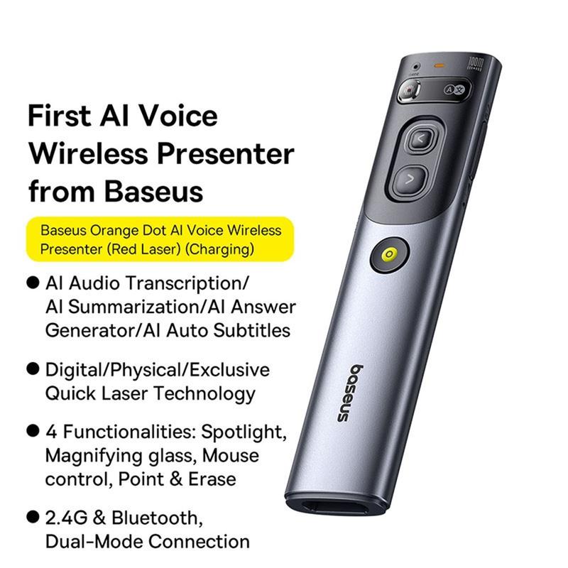 Baseus Orange Dot AI Voice Dual-Mode Wireless Presenter with Spotlight, Magnifier, Air Mouse, And Point Marker Functions - 2.4G, Bluetooth
