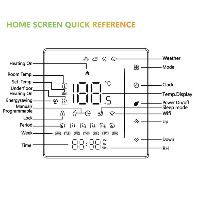 Built from durable PC+ABS flame-retardant material, this thermostat is designed for long-term performance and stable operation. Power outage protection helps preserve your saved settings, reducing the need to reconfigure the device after interruptions. Its embedded installation format fits a standard 86 x 86 mm wall box or a conventional European box, making it suitable for a wide range of interiors.
