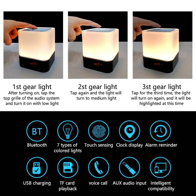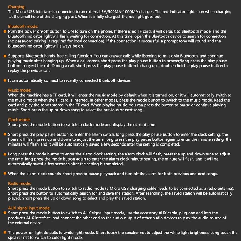 Features: Clock, alarm clock, Bluetooth wireless audio, TF card, U disk playback, support wired audio input, can be connected to the TV, computer, tablet, cell phone, and other audio sources