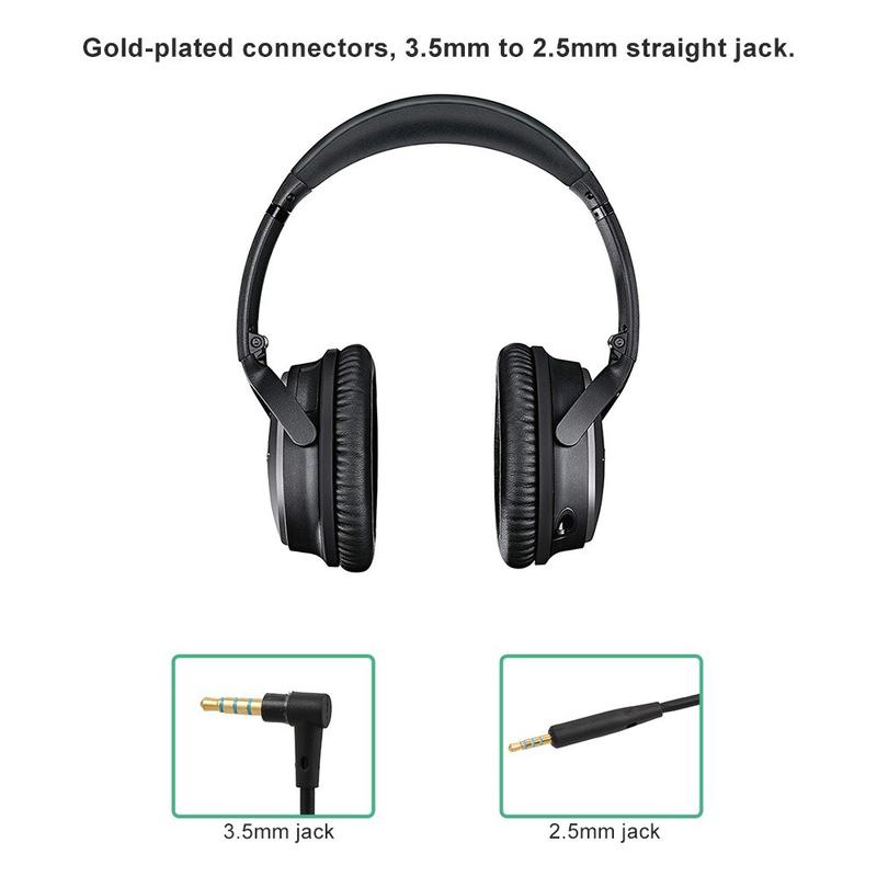 This line-control audio cable is perfectly suitable for BOSE QC25 headphones. Gold-plated connectors, 3.5mm to 2.5mm straight jack, which is durable and stable. Built-in microphone and volume line control function makes it convenient for use. High-quality TPE cable material can help prolong service life and tangle-free. It also has superb sound quality and high cold tolerance feature. Plus, 140cm cable length is enough for your daily use. This is definitely a better companion for your BOSE QC25 headphones.