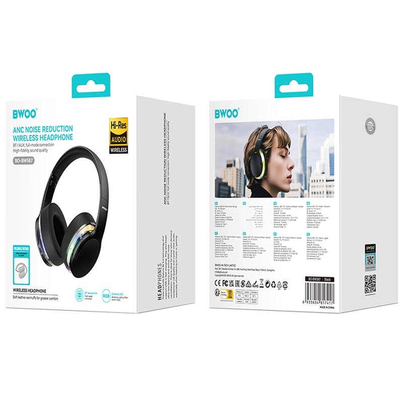 - BWOO over-ear wireless headset with ANC and RGB lights