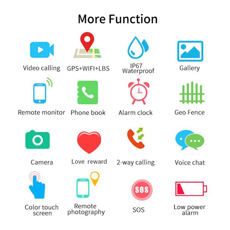- APP function: Phone book, intercom, dial telephone, step, alarm clock, Position, information center, love rewards, remote photos, video calls, SOS remind, work, family members, a class, SMS alerts, LBS, find watch, switch Settings, language, time zone, the collecting watches SMS, refused to strange calls, remote shutdown, remote restart and reset the device