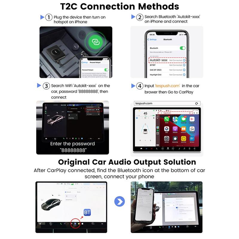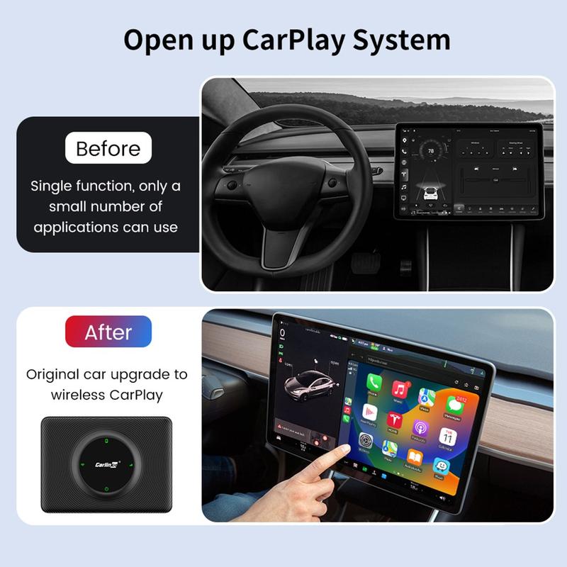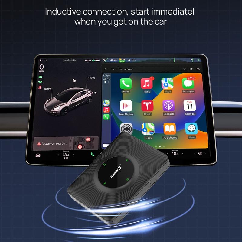 Podpora telefonů: Vhodný pro vozidla s továrně zabudovaným kabelovým carplay: Bezdrátový adaptér carplay je vhodný pro iPhone 6 a vyšší, Android 11 a vyšší, iOS 10 a vyšší. Pro modely Tesla. Tyto vozy musí mít z výroby zabudovanou funkci kabelového CarPlay.