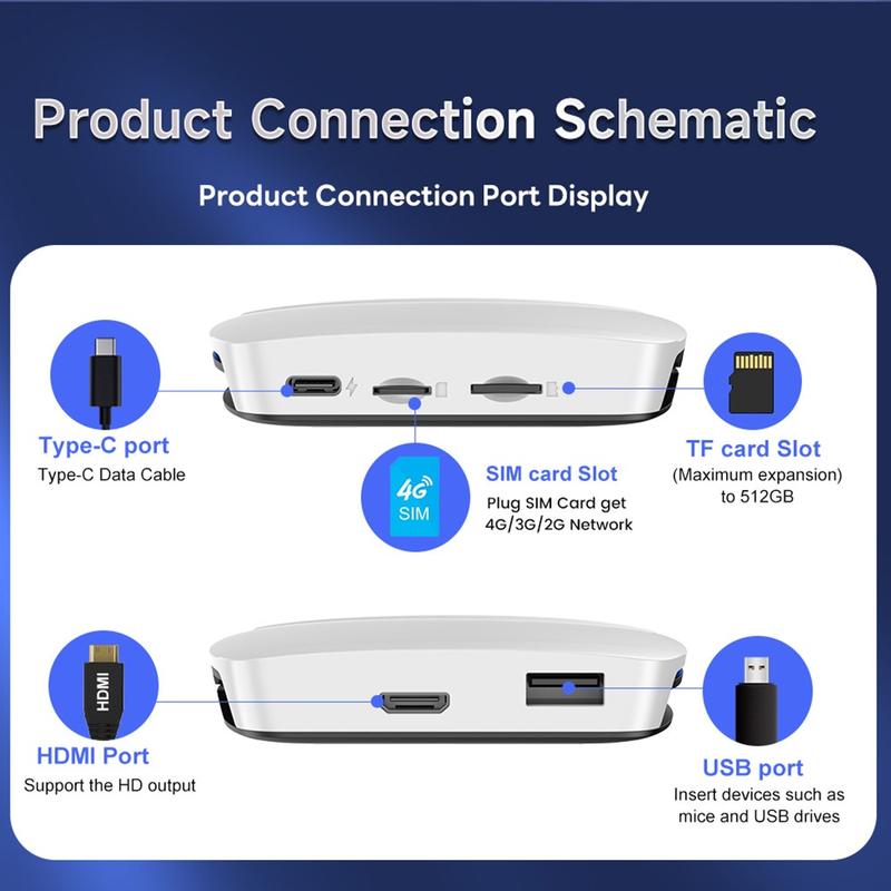 Ports: LED indicator, Type-C female port, TF card holder, USB female port, SIM card holder, HDMI interface