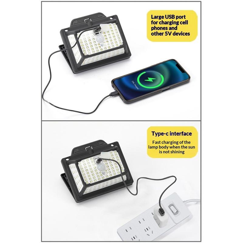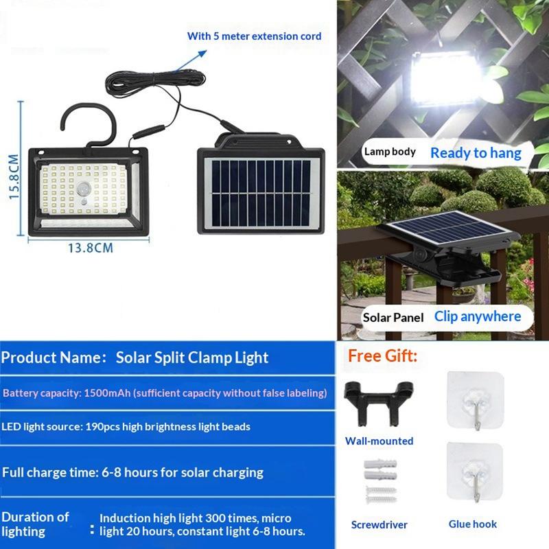 Light up outdoor spaces more efficiently with the CCP087 190 LED solar motion sensor light. Designed for practical everyday use, this split outdoor lamp combines powerful illumination, motion-sensing convenience, and flexible installation options in one smart lighting solution. With 190 LEDs and a five-sided luminous design, it delivers bright and even light coverage, making it ideal for gardens, balconies, garages, paths, entrances, and camping setups.