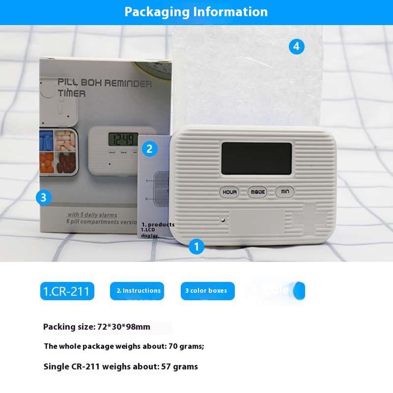 - At 62 g, the CR-211 weighs less than two AA batteries, yet its six compartments can hold approximately 30 average-sized tablets—enough for a full week of twice-daily therapy.