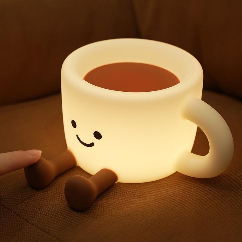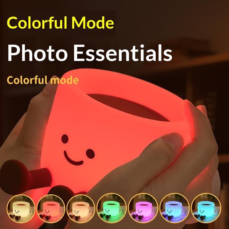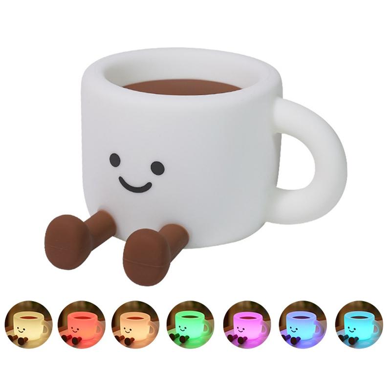 Add cosy vibes to any room with this cute coffee cup shape night light—a fun bedside lamp that also works as a phone stand and portable mood light. With 7 colour-changing LED options and 3 brightness levels, it's perfect for relaxing evenings, a soft night glow, or creating ambience for photos and video. Simple tap control makes it effortless to use, while the 30-minute auto-off timer helps save energy and prevents the light from staying on all night. Made from soft, food-grade silicone, it feels pleasant to touch and can even double as a stress-relief squeeze toy. Rechargeable via USB-C, it's easy to take along for travel, camping, or cosy setups anywhere.