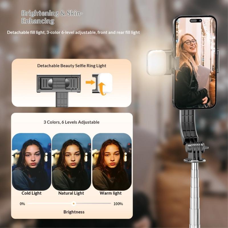 The detachable beauty fill light offers 3 colour modes (warm, cool and natural) with 6 adjustable brightness levels. It supports both front and rear illumination, helping you achieve flattering lighting in different environments and lighting conditions.