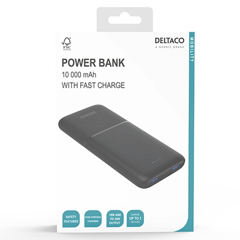 Deltaco 10000mAh Power Bank - 20W USB-C PD and Dual 18W USB-A Fast Charging Portable Charger