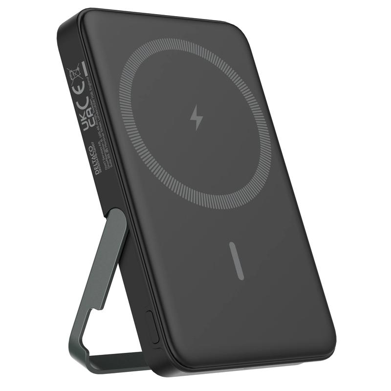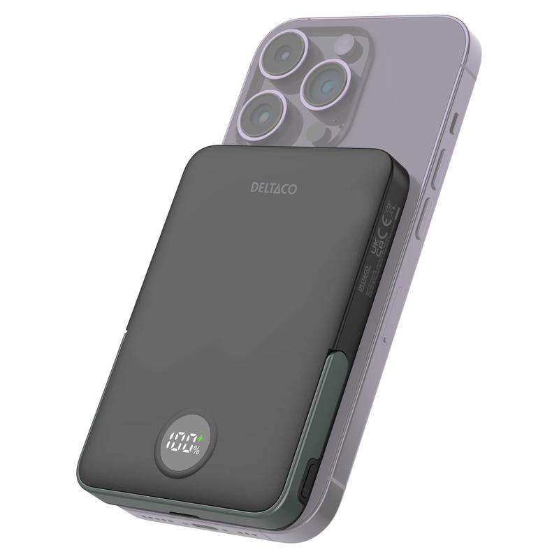 Keep extra power close at hand with the Deltaco 5000mAh magnetic wireless power bank. Designed for everyday convenience, this compact portable charger combines wireless charging, USB-C PD fast charging, and a built-in stand in one practical device. It is a great choice for commuting, travel, workdays, and everyday backup charging when you need a simple and tidy power solution.