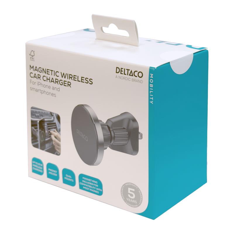 Keep your phone charged and within easy view while driving with the Deltaco detachable wireless car charger. Designed for convenience and flexibility, this Qi2-compatible charger delivers up to 15W wireless charging for compatible devices while securely holding your phone in place with a built-in magnet.