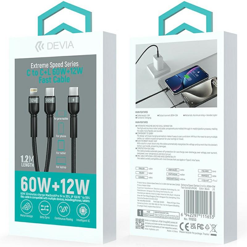 Devia EC648 Extreme Speed 2-in-1 USB-C Cable - USB-C to USB-C 60W PD and Lightning 12W, Braided Nylon, Data Sync, 1.2m