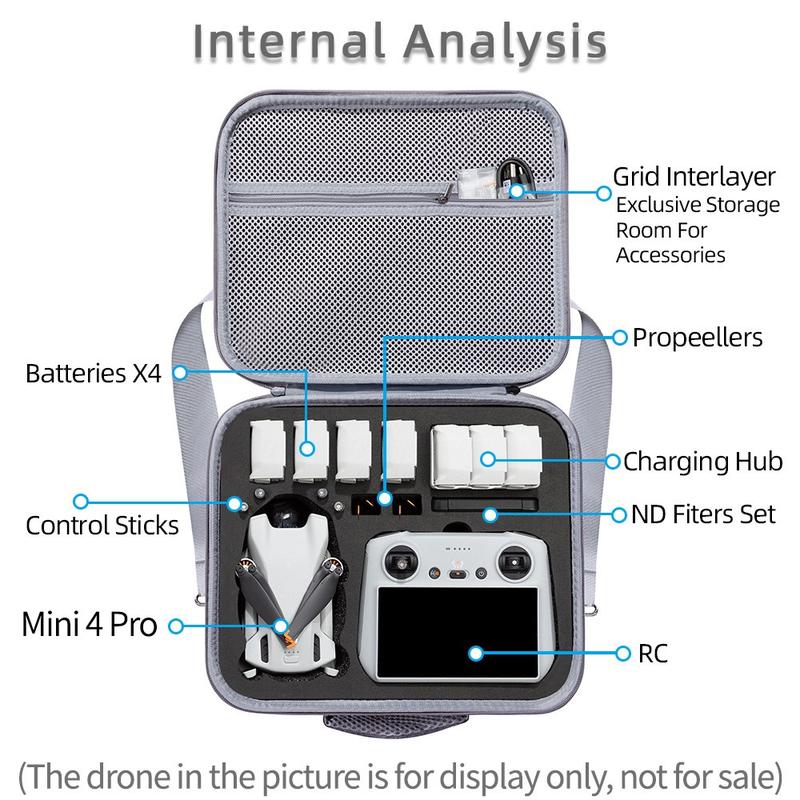 This carrying case combines functionality with elegance, offering a reliable solution for transporting and storing your DJI Mini 4 Pro drone and its accessories. Its custom design ensures a perfect fit, while the premium materials and thoughtful features provide durability and convenience.