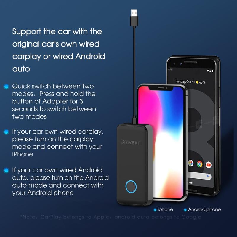 Wireless CarPlay conversion: Transforms wired CarPlay into wireless without the need to replace the screen, ensuring compatibility with the original car system and facilitating easy switching between modes